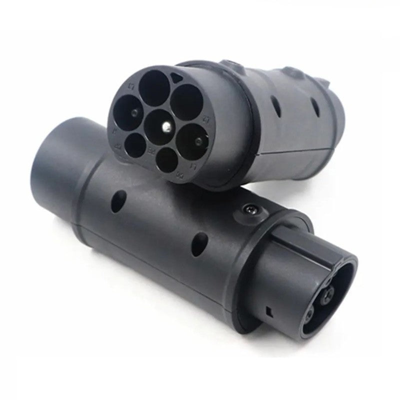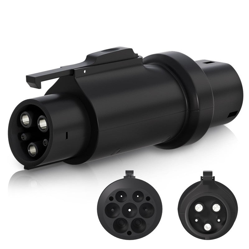 Adapter for connecting an electric car with a Type 1 connector (imported from the USA or Asia) to a Type 2 charging station with a cable (European standard). Charging with the adapter can be done with a maximum power of 7.4 kW.